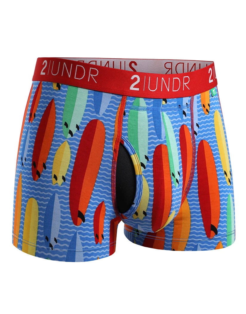 The Swing Shift Trunk from 2UNDR is a square cut trunk, 3 inches in length. It is made of a soft and smooth fabric that feels cool to the touch. This fabric is also durable and resistant, maintaining its quality after many washes and wears. Featured on the elastic waistband is the repeating 2UNDR logo.