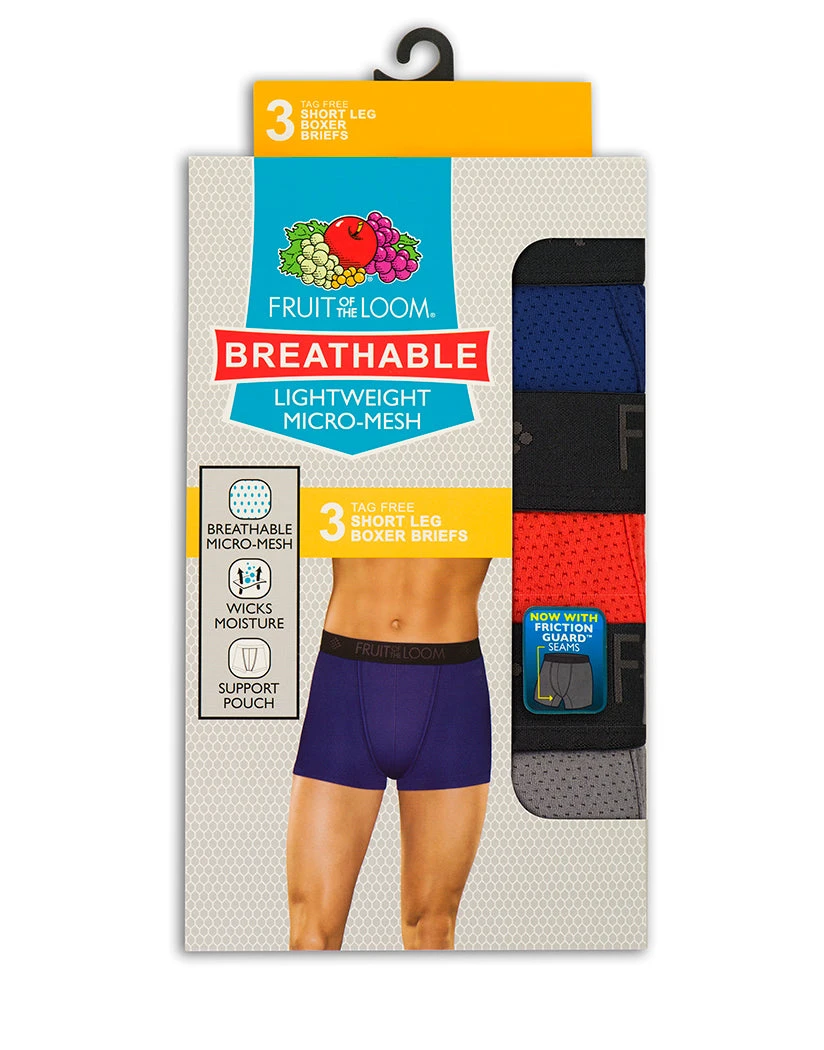 The Fruit of the Loom Breathable Micro-Mesh Short Leg Boxer Briefs feature lightweight breathable mesh. This allows for optimal airflow to keep you cool all day long. Moisture wicking technology keeps sweat at bay, away from the skin. A contoured pouch offers the extra support you need. A tag free, wide waistband feels ultra soft against the skin for extra comfort.