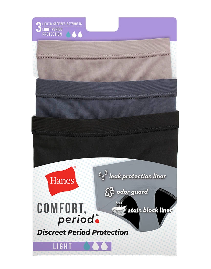 The Hanes Comfort Period.™ Boy Shorts Period Underwear has a discreet, built-in liner for light protection. Feel free knowing you have the confidence of an extra layer of protection during your period or protection while you are pregnant. Whatever your needs are, this style underwear has you covered. Shop this style now, conveniently in a three-pack.
