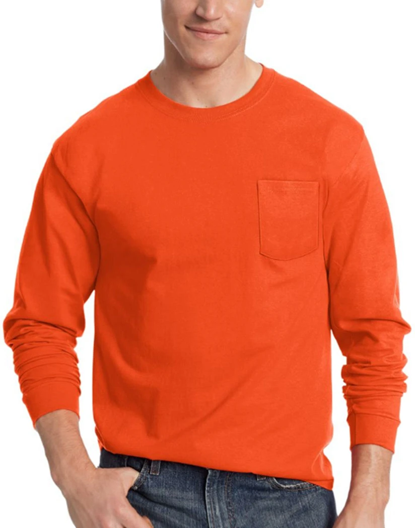 The Hanes Men’s TAGLESS Long-Sleeve T-Shirt is made from super soft, preshrunk cotton that offers an incredible fit from the moment you put it on. Double-needle, cover seamed neck holds its shape, while a tagless design offers extra comfort. A 5-point chest pocket adds extra flair to your casual look.