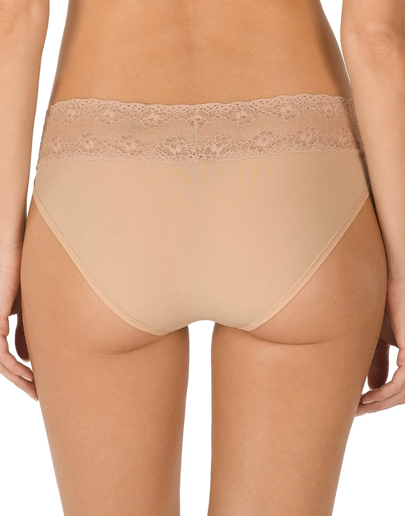 A seductive panty, the Natori Bliss Lace V-Kini falls perfectly flat against your skin. Made of sheer floral lace, this Natori bikini features a geometric stretch lace trim along the waistband for a chic combination of femininity and symmetry.