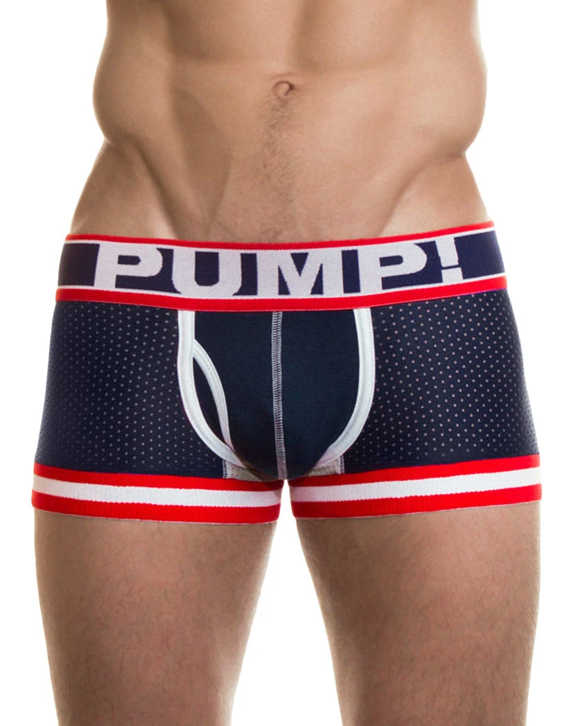 The Big League Low Rise Mesh Trunk Navy from PUMP! got its name for a reason– when it comes to style and comfort, it’s the ultimate trunk. This underwear has a tight fit with a square cut, and a low rise fit that falls below the natural waistline. It is made from a mesh fabrication that creates breathability, airflow, and ventilation. It will leave you feeling cool, dry, and comfortable. The contour pouch is made from a soft cotton, and has a vertical center seam, providing you with support. Red and white horizontal stripes around the leg bands complement the navy body. The wide waistband lays flat against the body and features the PUMP! logo on the front and center, as well as stripes that match the leg bands.