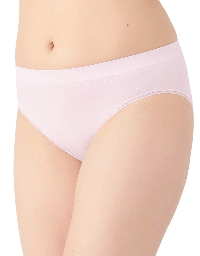 The Wacoal B-Smooth Bikini is simple, soft, and sweet. This bikini has a seamless design with 4-way stretch technology so you feel sleek and free to move as you please. A decorative knit-in design and lace leg trim add pretty and fashionable details. The bikini falls below the waist, with a fabric incorporated waistband that doesn’t interrupt the design to hold you in place. Flat and soft leg elastics with a cotton-rich gusset keep you comfortable. The bikini even has a full coverage rear, so you can wear this style with any outfit confidently. You’ll love the fit and feel of this panty!