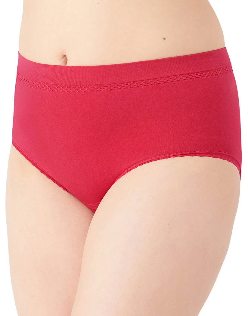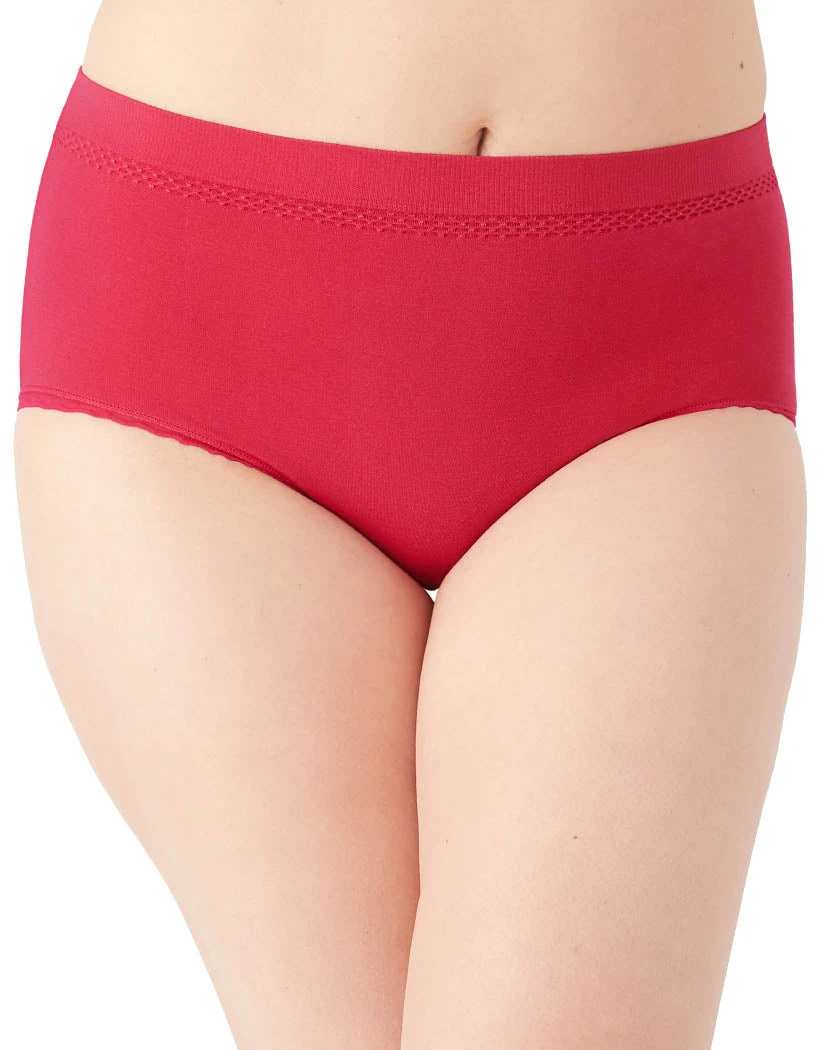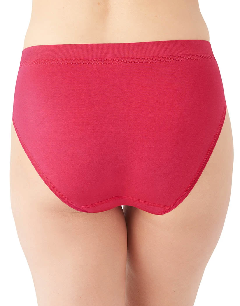 The Wacoal B-Smooth Hi Cut is a great pair of panties. This hi-cut brief has seamless fabric with a 4-way stretch. The panty’s flat leg openings are trimmed with lace and there’s a pretty knit design under the waistband for a fashionable touch. The exposed elastic waistband is high rise for a figure-flattering fit. This brief has full coverage, so you stay comfortable all day long.
