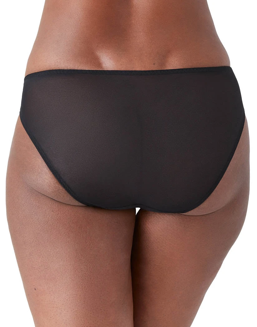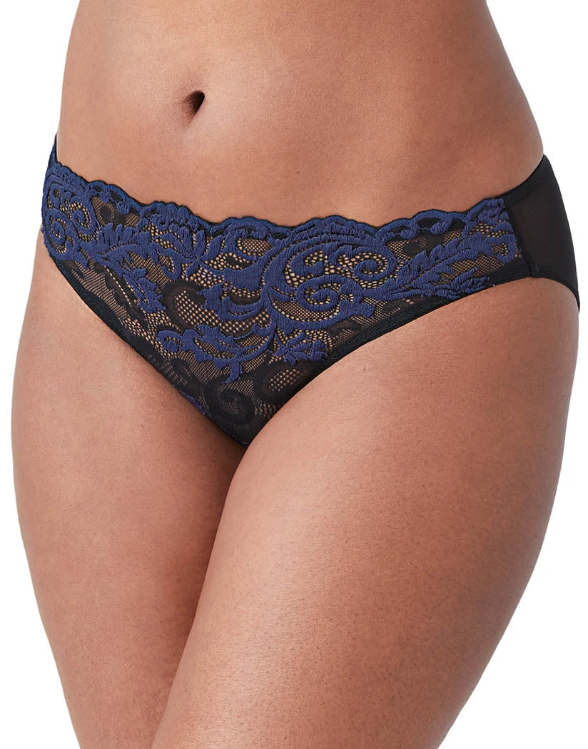 The Wacoal Instant Icon Bikini 843322 is a beautiful and breathable style. This bikini is made of stunning lace fabric with a cotton gusset for comfort. It falls below the waist for a figure-flattering fit and is held secured by a scalloped trim, not a waistband. The moderate coverage rear keeps you secure and comfortable. This is an airy and easy style you’ll love the look of.