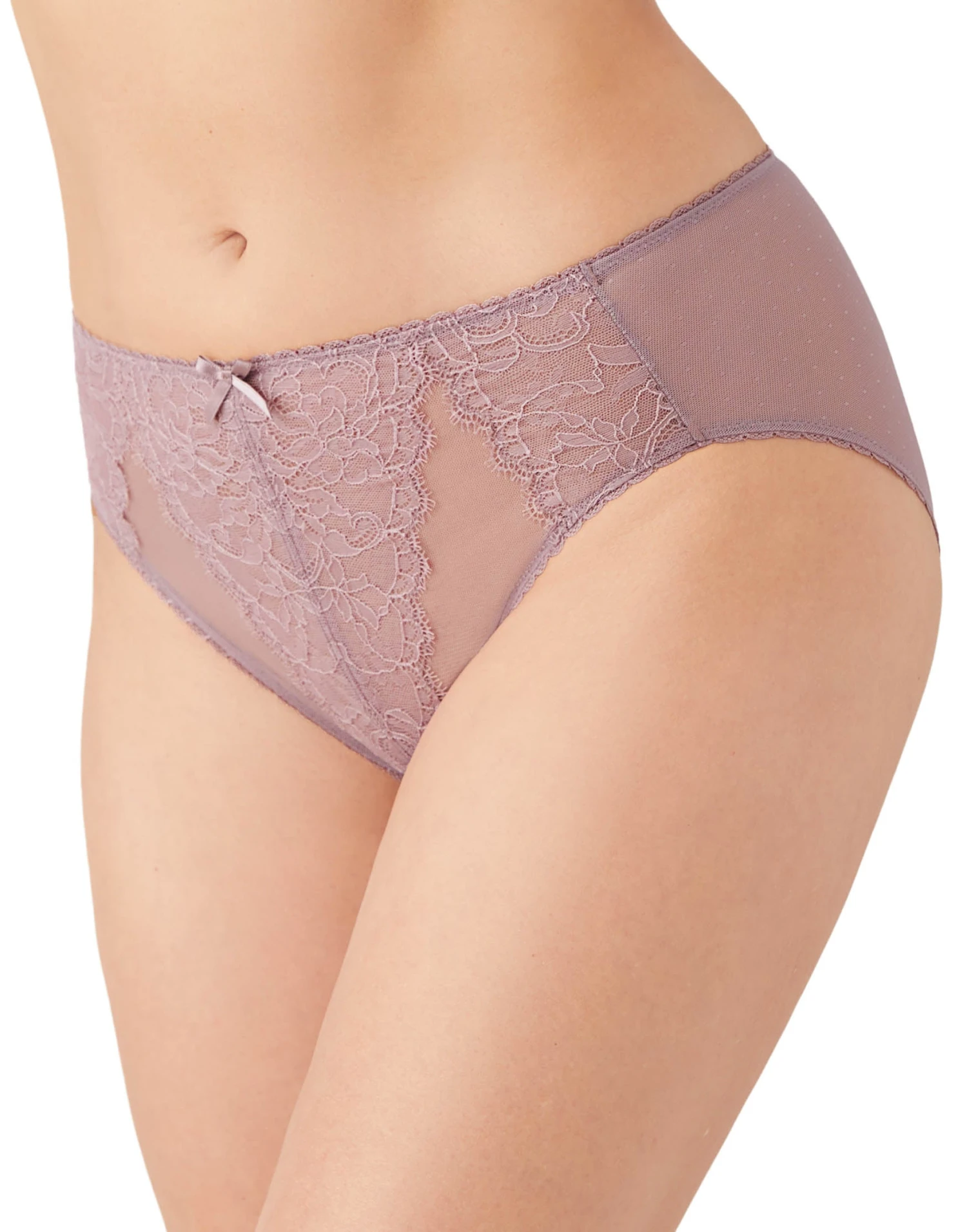 You’re guaranteed to look fabulous in the Wacoal Retro Chic High Cut Brief because it features a hidden tummy-smoothing panel. It’s made from exquisite stretch lace, inspired by vintage lingerie. It offers full coverage in sheer, lightweight mesh. The high-cut legs lend the illusion of longer legs. Add some glamour to your day with the Wacoal Retro Chic High Cut Brief. Pair with the matching Wacoal Retro Chic Full Coverage Underwire Bra 855186.